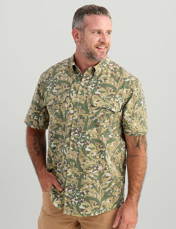 The Huntley Printed Short Sleeve Button-Down is a versatile, high-performance garment that excels in both comfort and function. With 4-way stretch fabric, a laser perforated back for breathability, moisture-wicking properties, and sun protection, it’s well-suited for a variety of outdoor activities. The security front pockets and interior eye wipe are convenient features that add practicality to the design, making this shirt not only functional but also user-friendly. The combination of polyester, cotton, and spandex creates a shirt that is durable, comfortable, and flexible, ensuring that you can move freely while staying cool and protected during your outdoor adventures. Whether you're hunting, traveling, or just enjoying the outdoors, this shirt provides the comfort and performance you need.